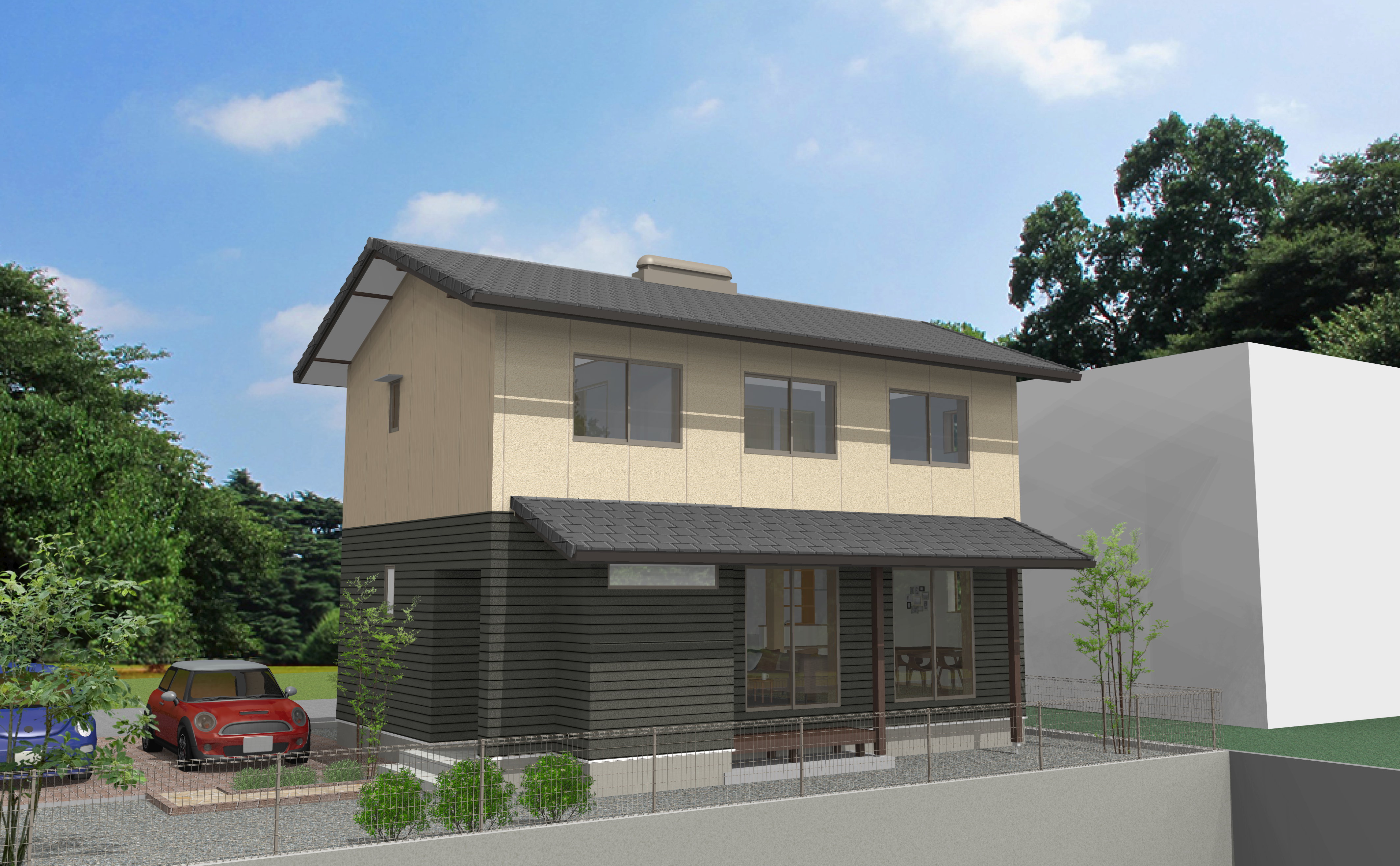 外観デザインは平瓦屋根に、ジョリパット吹き付けとサイディングの2トーンの外壁が特徴。
