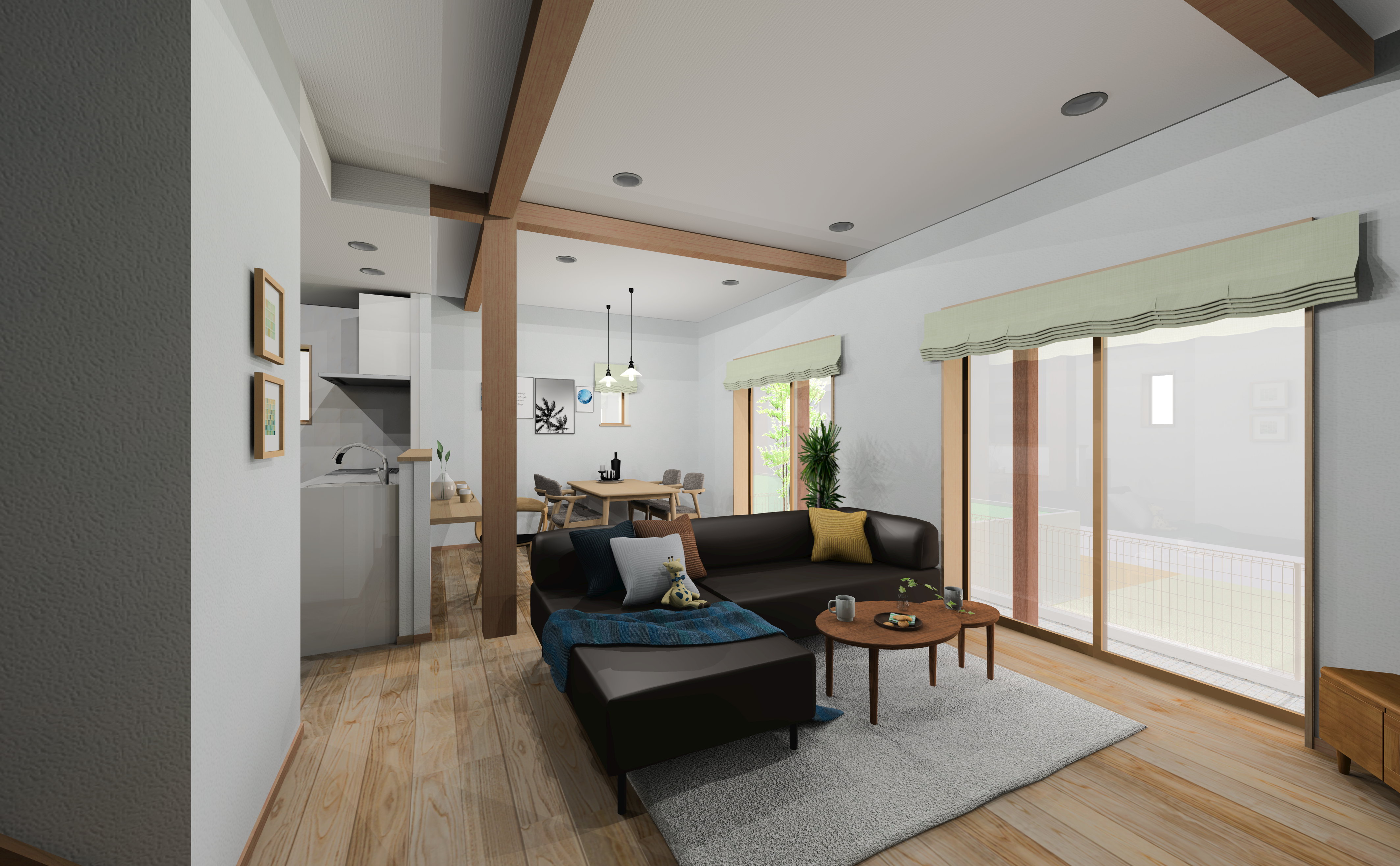 天井の梁からは力強くもやさしい存在感が感じられ、見上げるたびにほっと心が安らぎます。